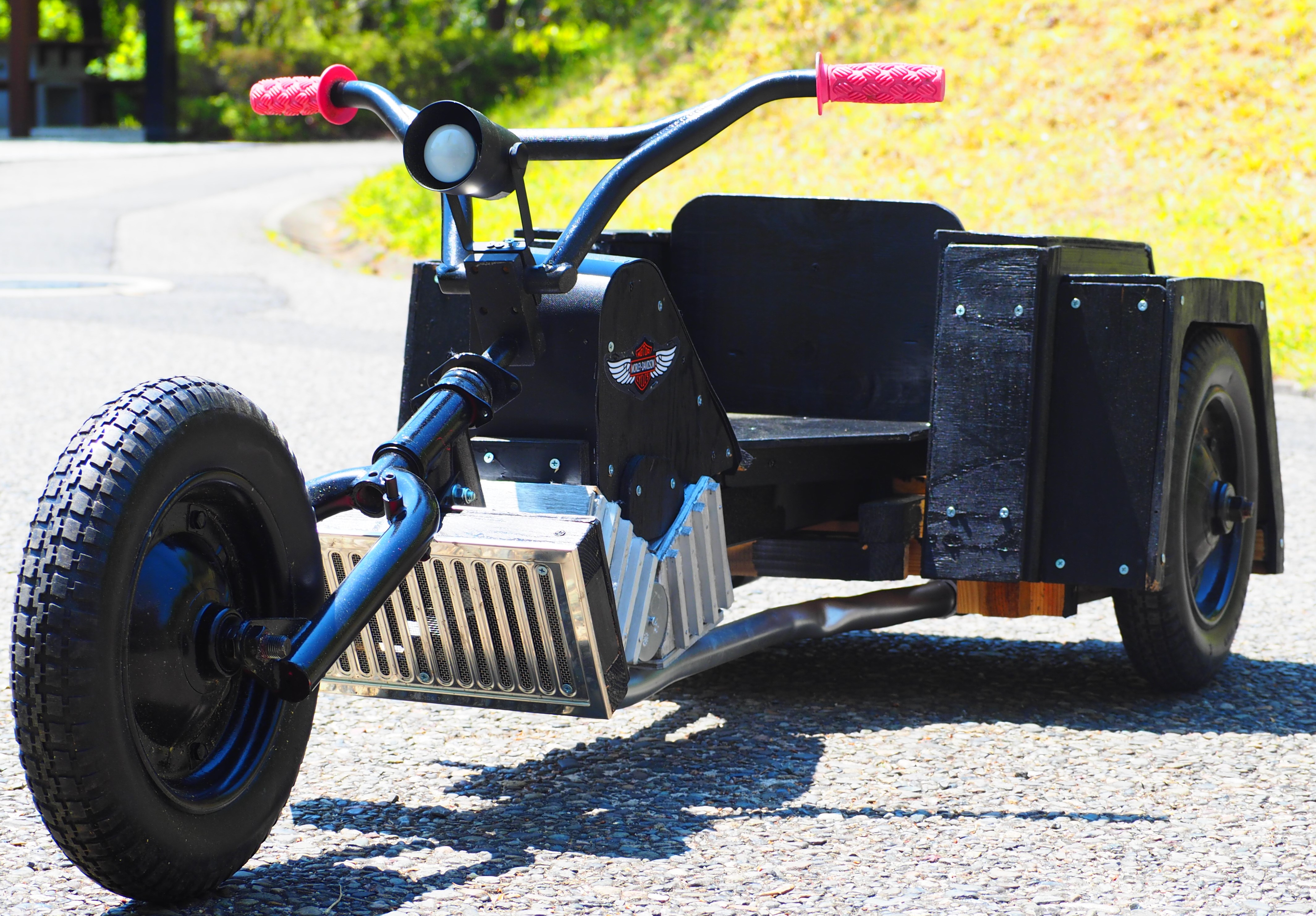 奇跡の完成度!! 材料の関係で、後ろ半分は本物に近いですが、前半分が昔のハーレーのようになってしまいました・・・。しかしっ!!タクシー同様に、奇跡の結果オーライで、ものすごくカッコいい仕上がりになりました。ラジエーターから、エンジン部分にマフラーと、大変でしたが、ホンモノっぽく出来ました。 人力ですが、実際に乗って、ハンドルを切って進むことも可能です。 マッドマックスからの三輪つながりで、次の一台(前代未聞の三輪車)も、作成中ですので、乞うご期待!!